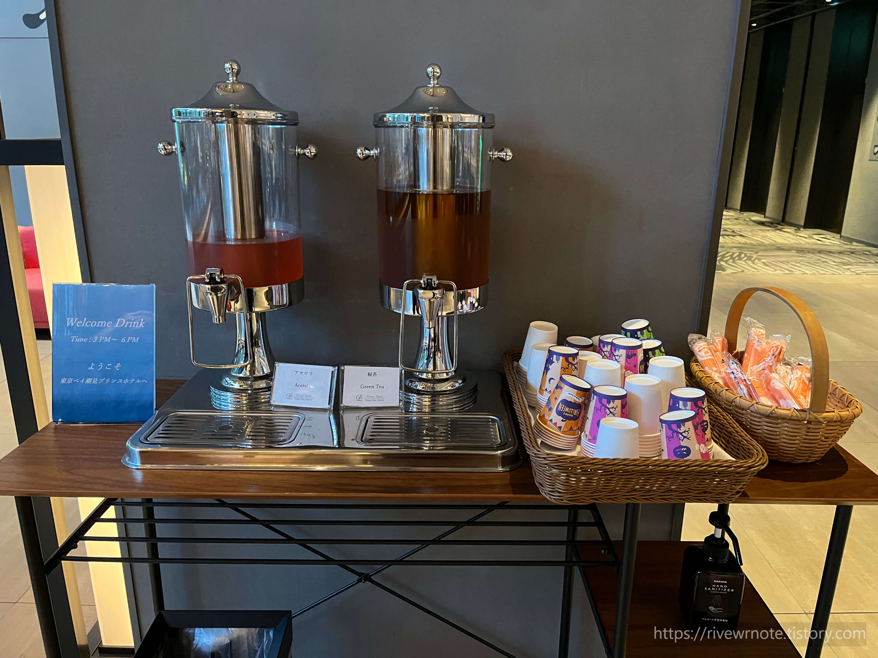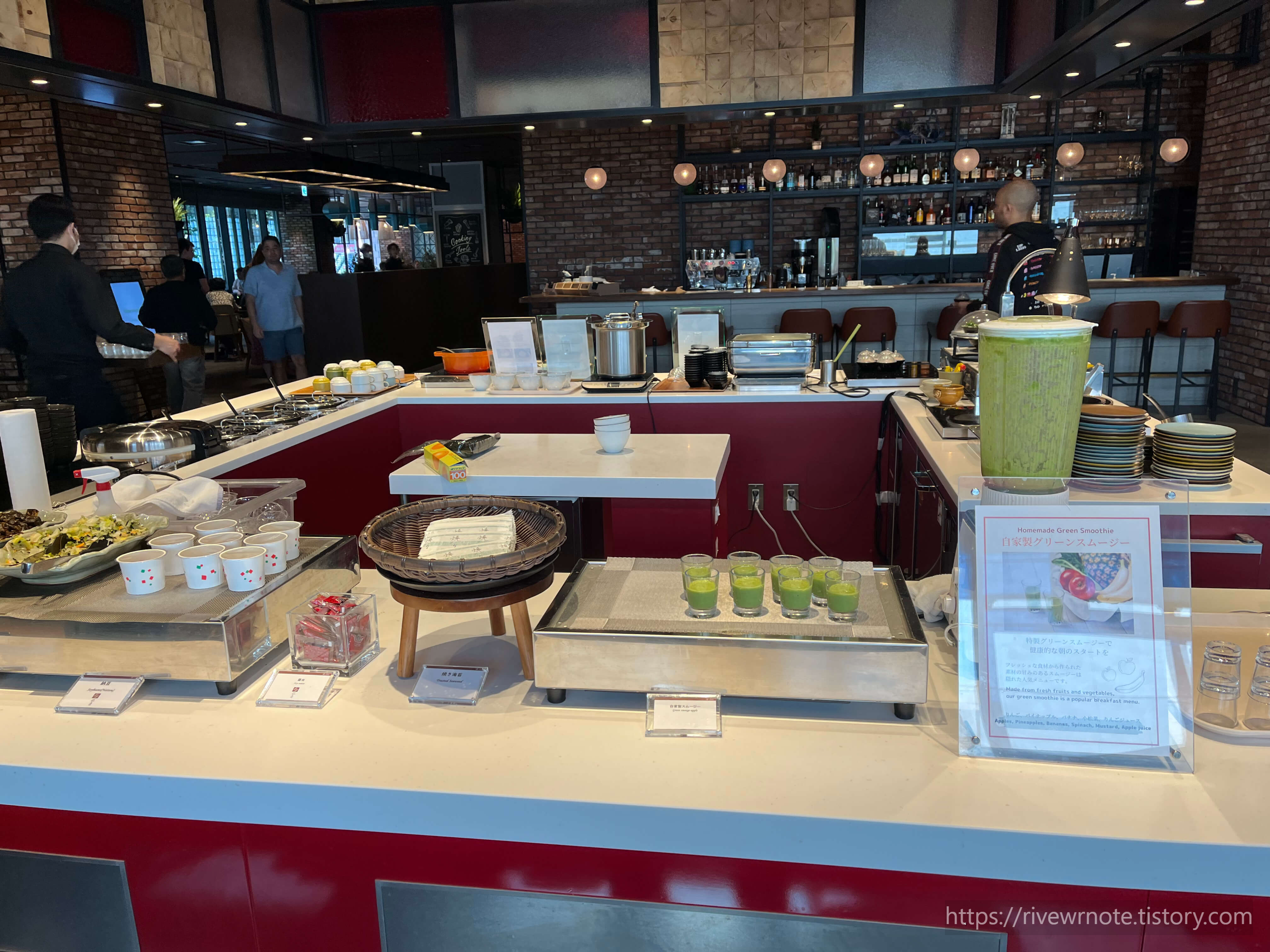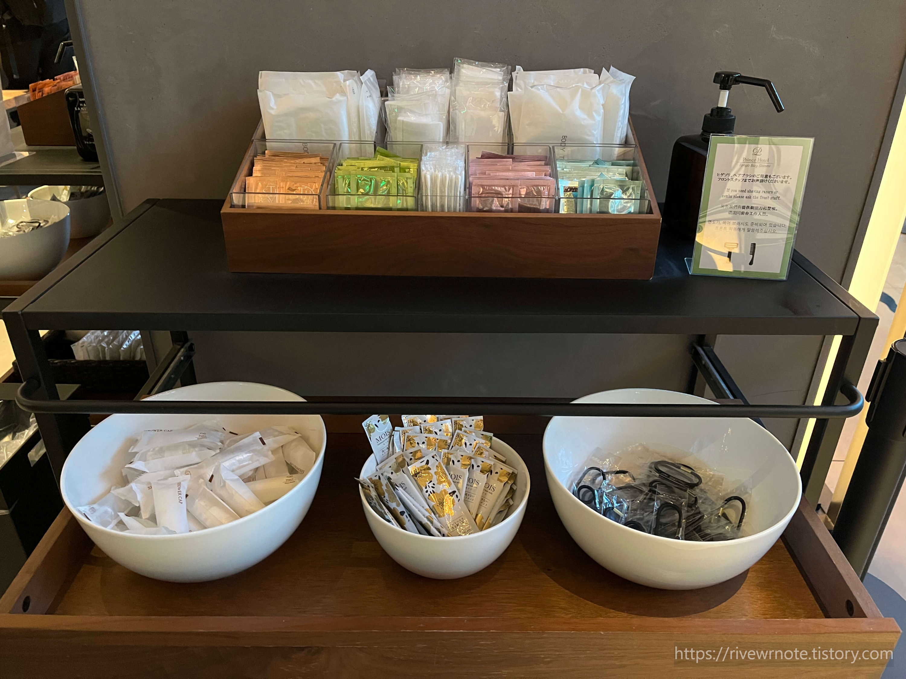 체크인하는 곳 앞에 프리드링크 주스와 프리 어메니티 공간이 있습니다.