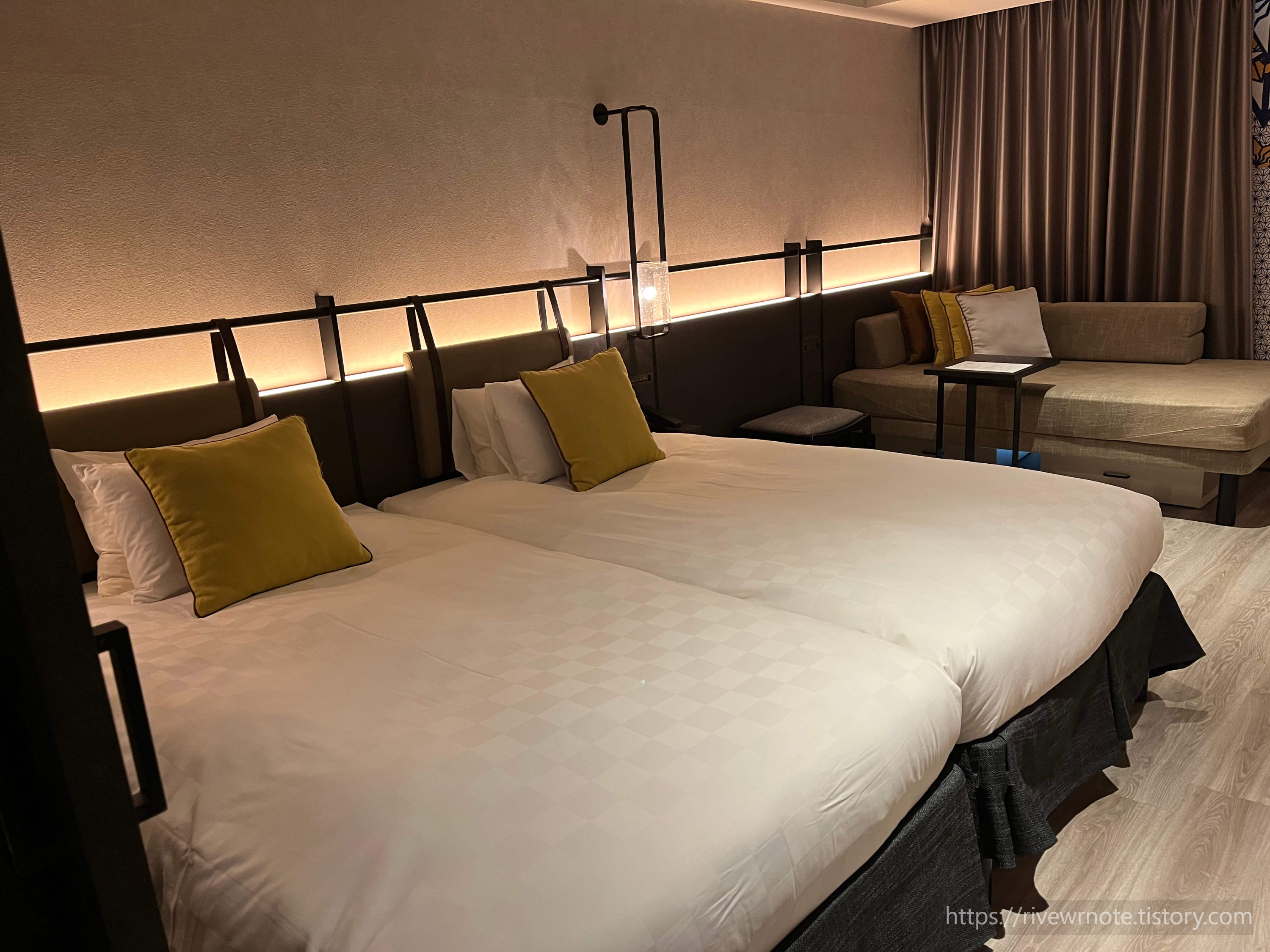 싱글베드 2개가 붙어 있어 더욱 넓게 느껴졌습니다.