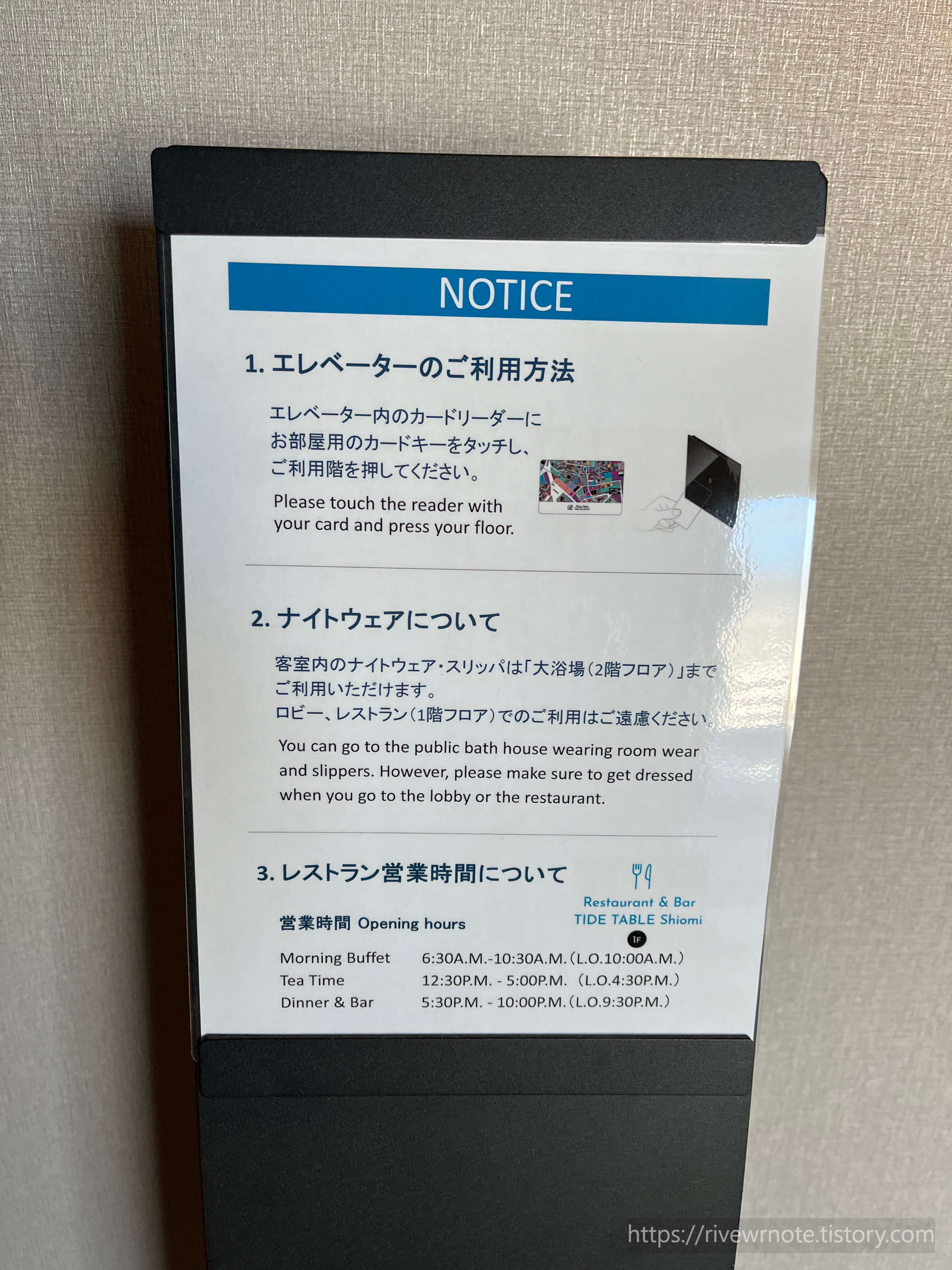 엘리베이터 탑승 시 객실카드로 터치 후 타야 하며, 대욕장 이동시 주의문