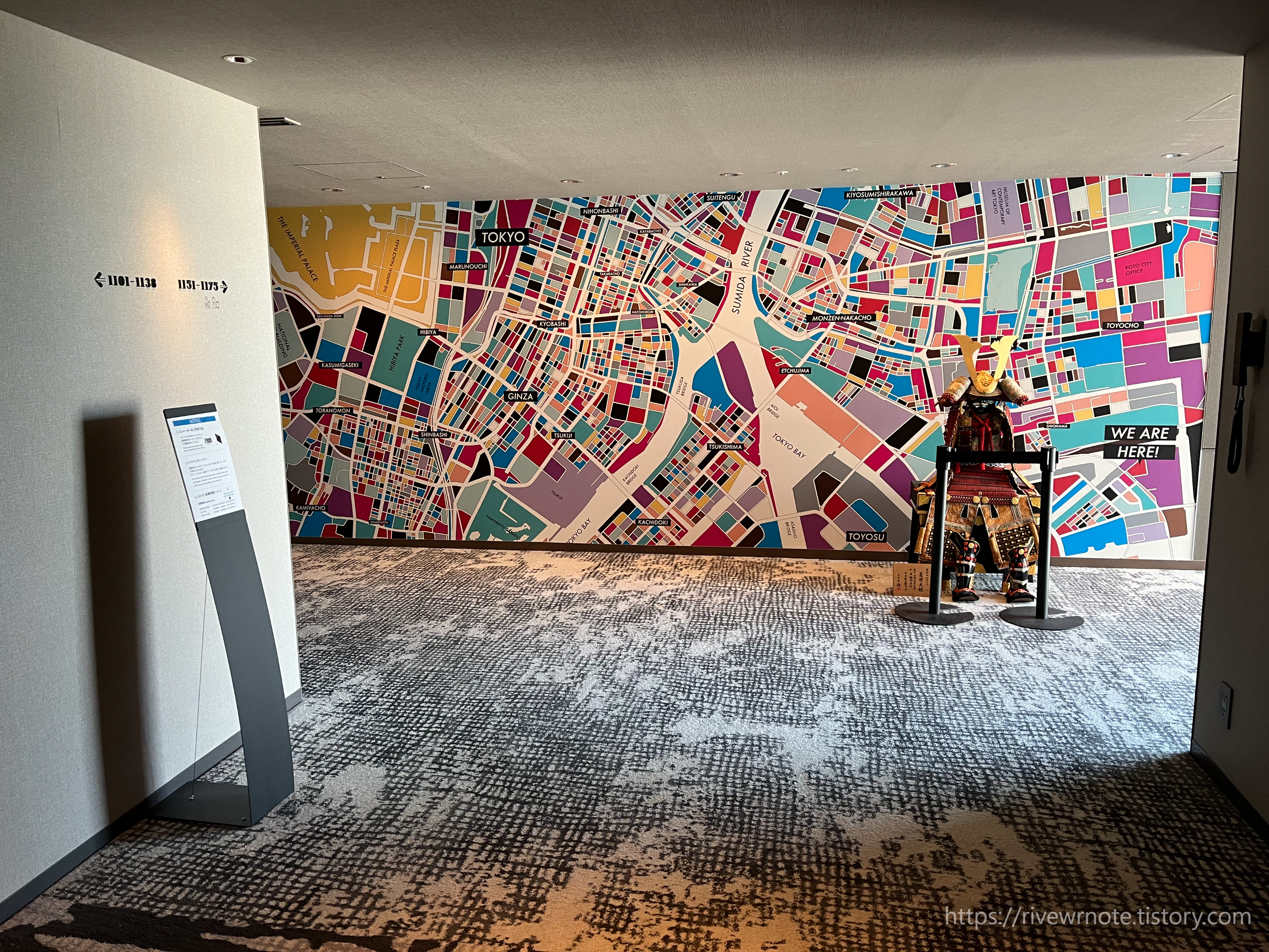 복도에는 도쿄 지도가 벽면에 그려져 있고 일본풍의 동상이 장식되어 있습니다.
