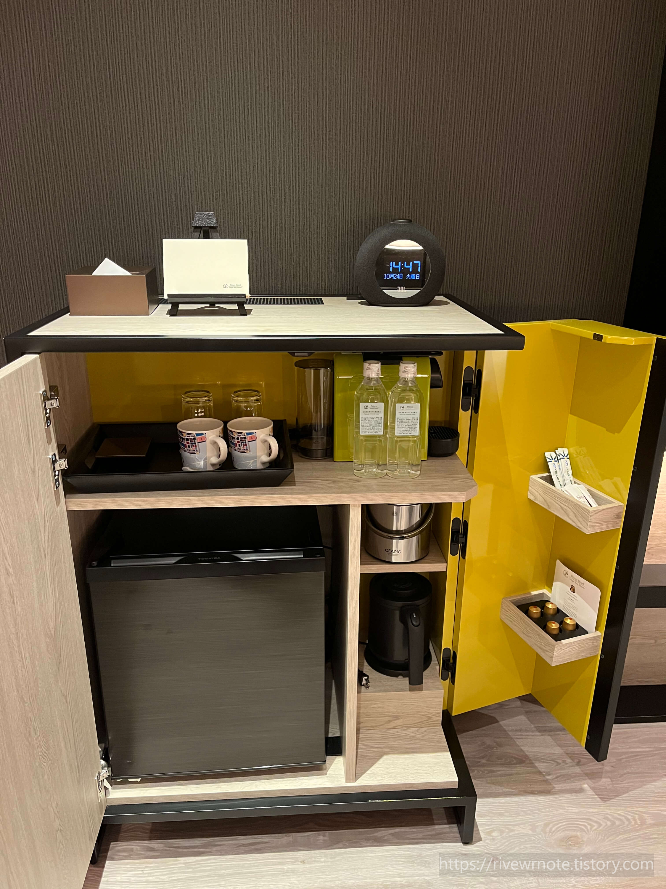 생수 2병이 제공되며 냉장고와 커피 캡슐이 있습니다.
