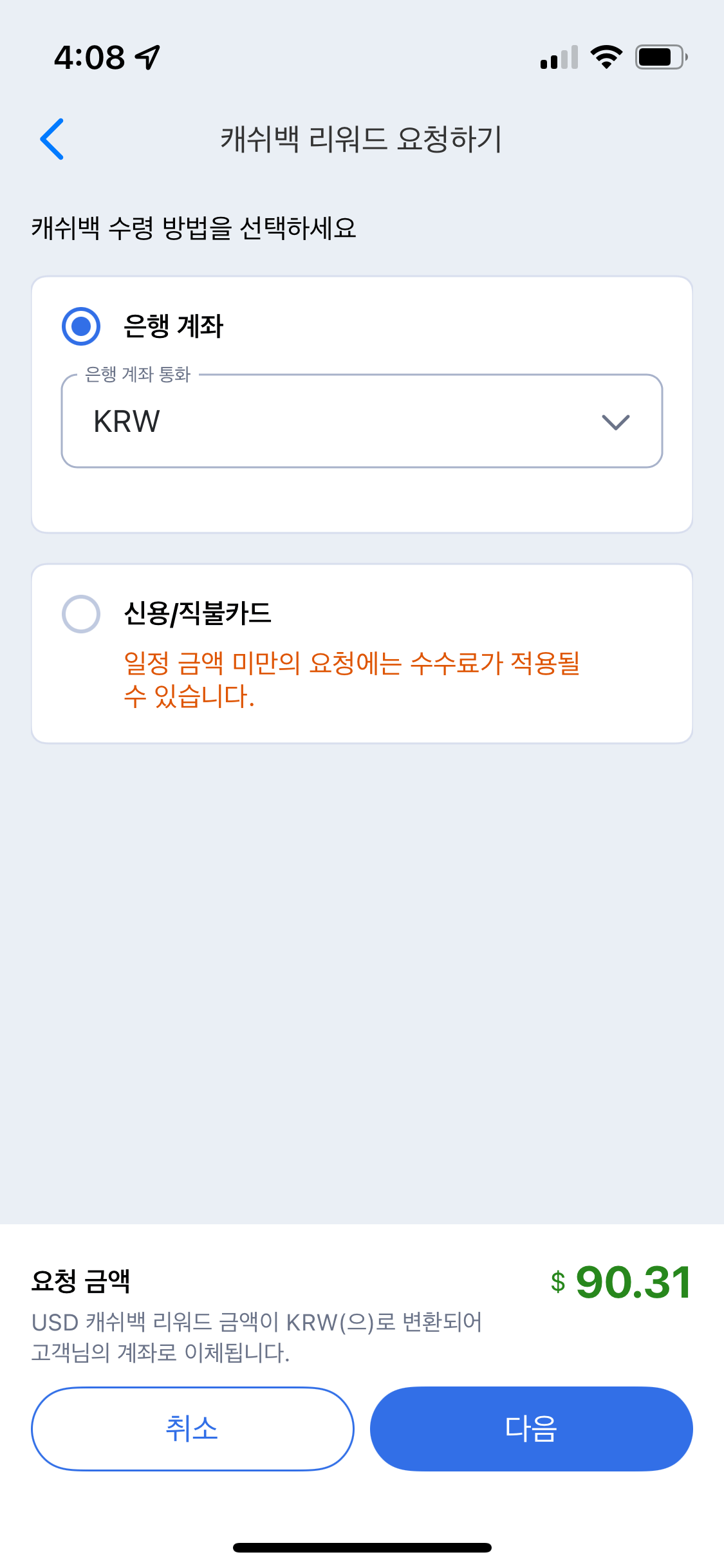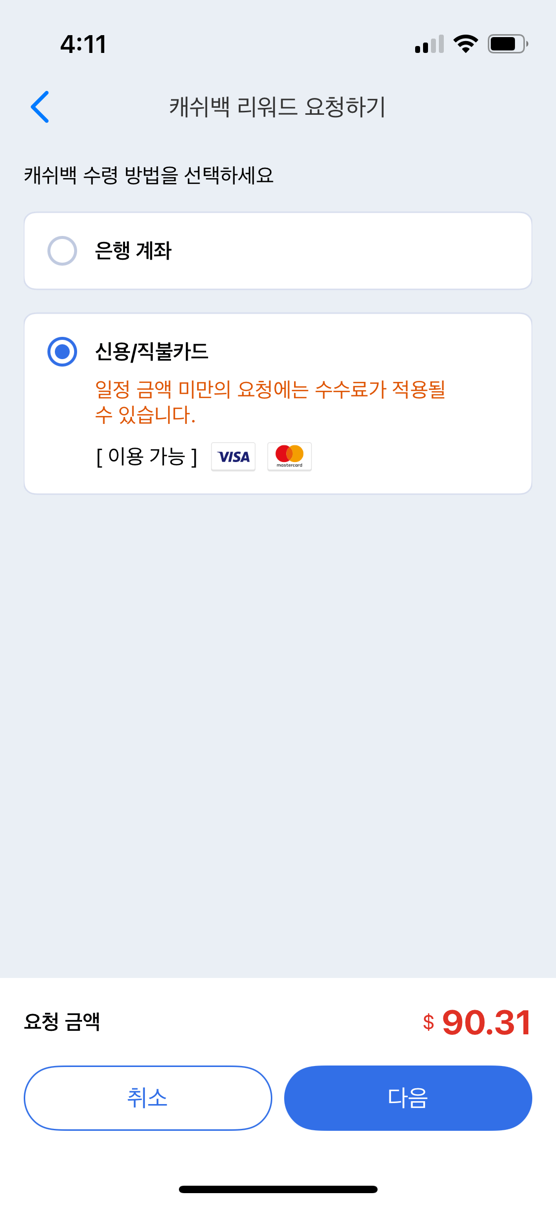캐쉬백 수령 방법을 선택하면 되는데 은행계좌/신용 직불카드가 있습니다.
