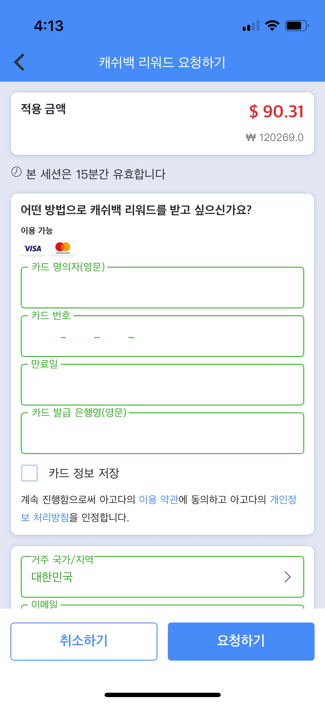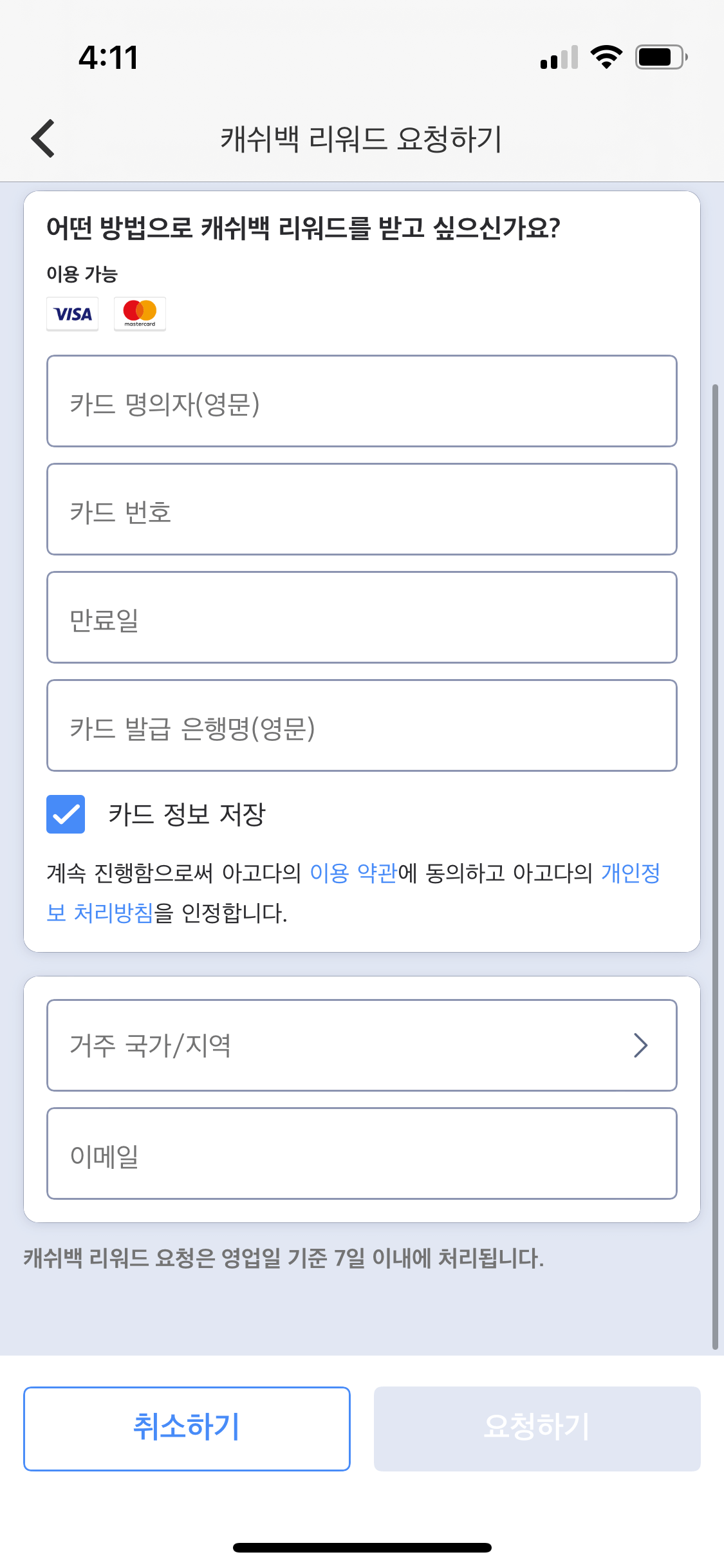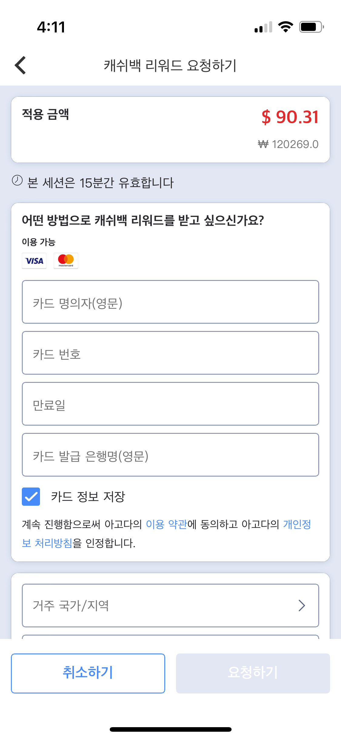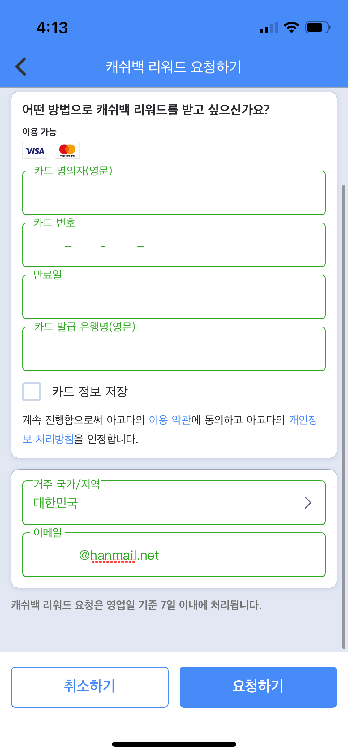 상단의 캐쉬백 리워드 요청하기를 누릅니다.