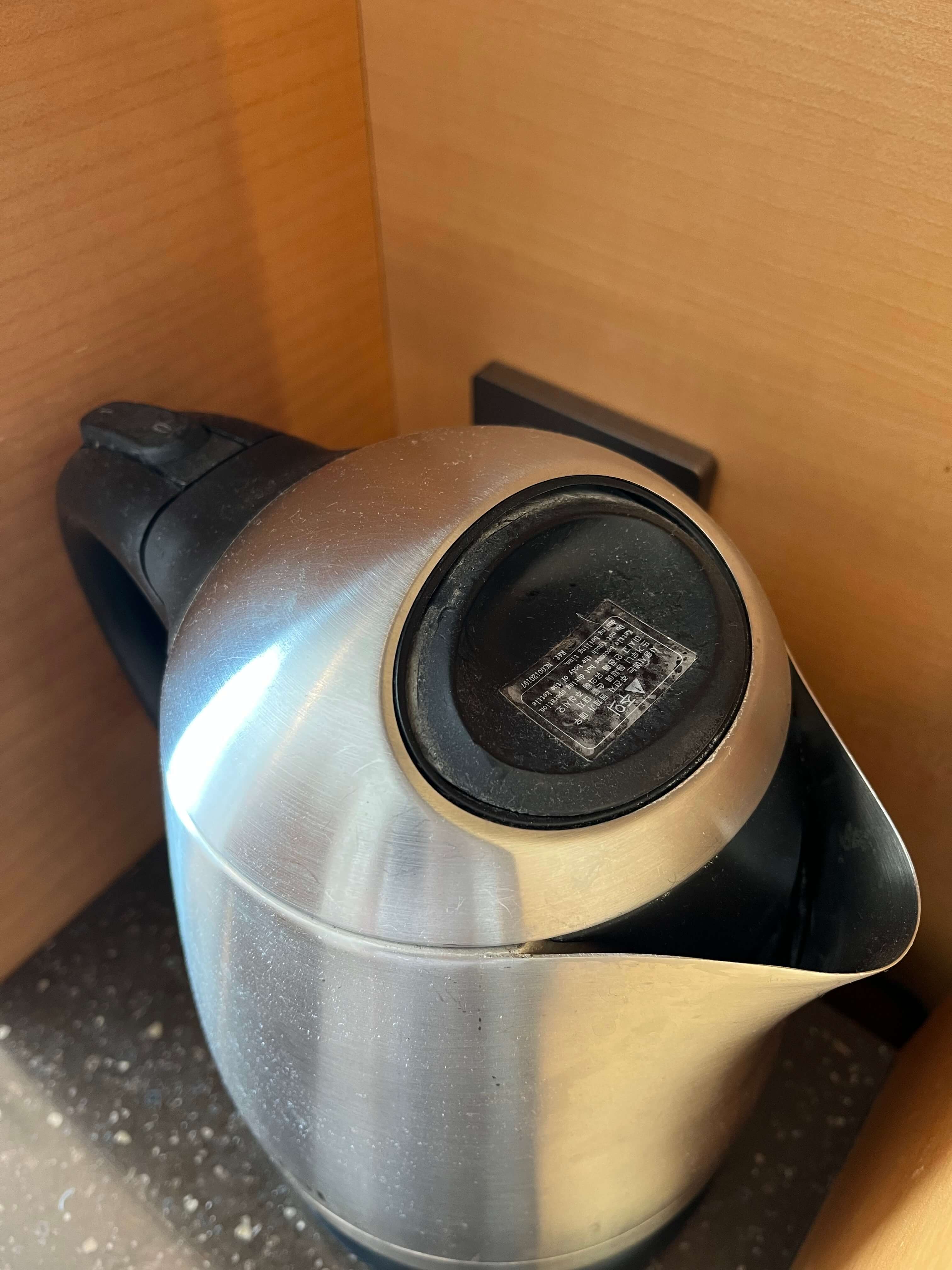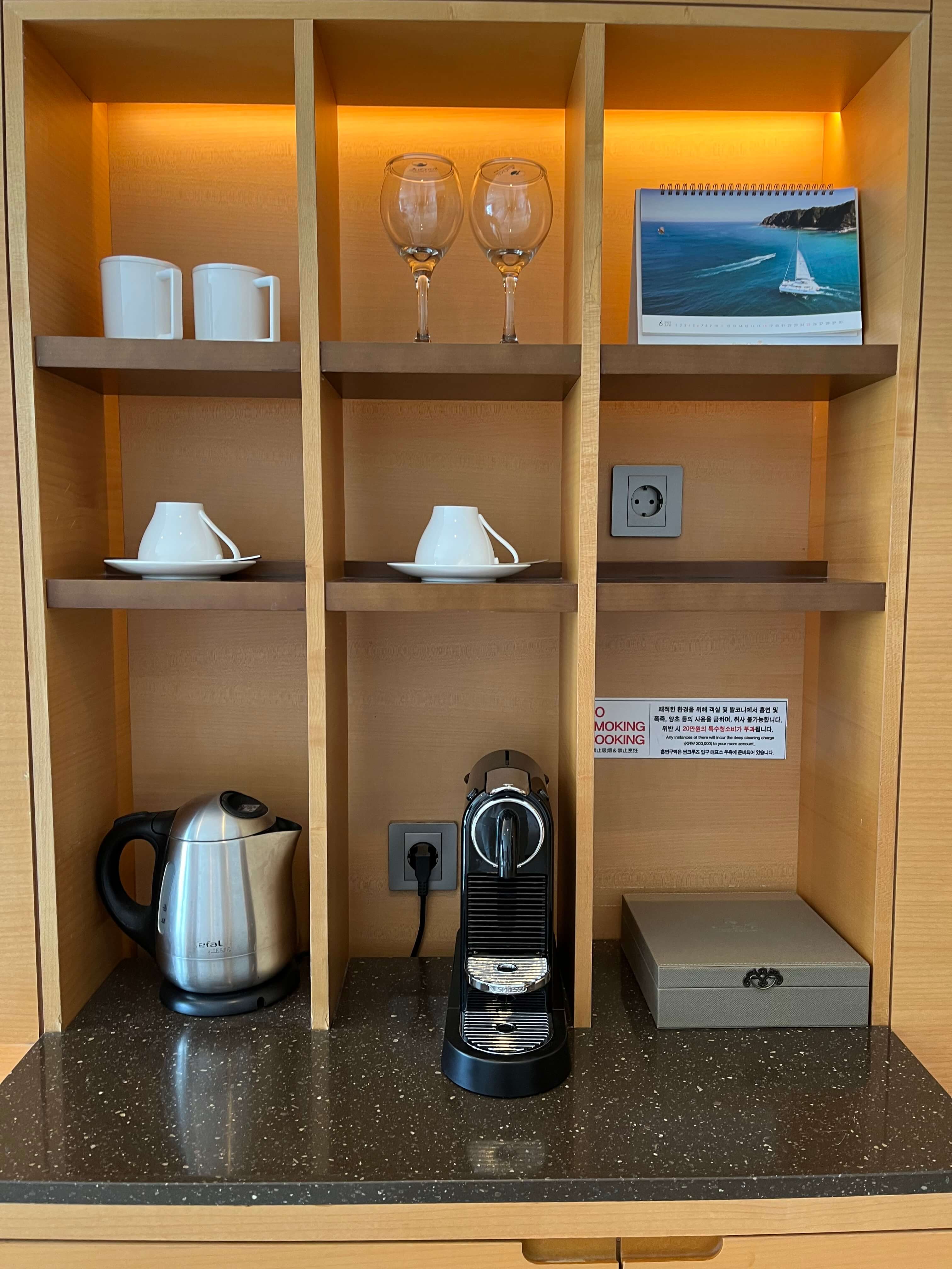 침대 앞쪽에는 TV, 드라이기, 네스프레소 머신, 전기주전자, 와인잔이 준비되어 있는데