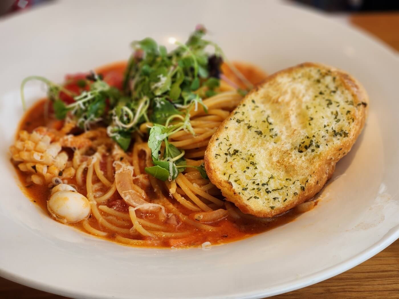해물이 들어간 토마토 파스타, 불고기 된장찌개 정식, 돈까스를 주문했습니다.
