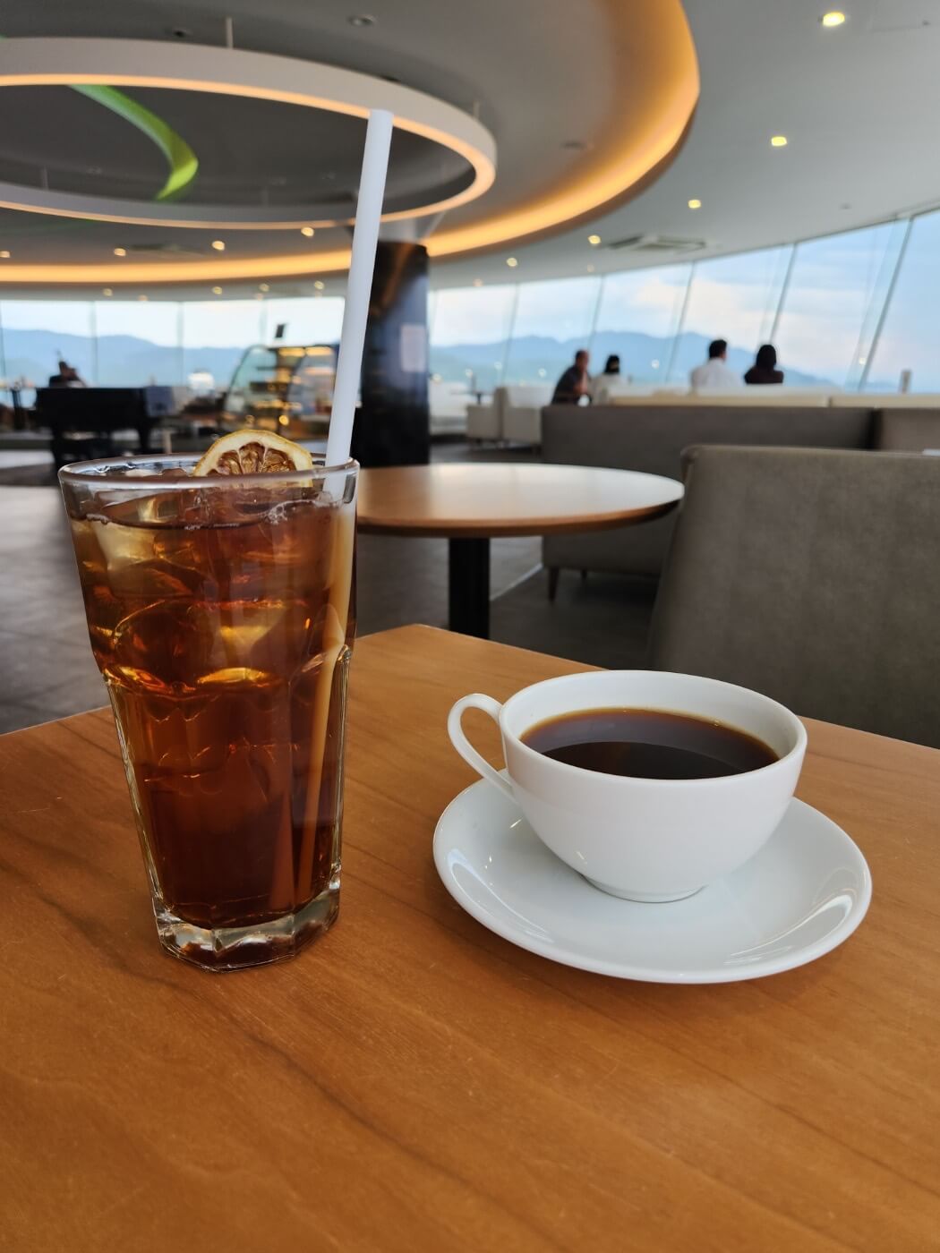 쿠폰으로 받은 아이스티와 따뜻한 커피.